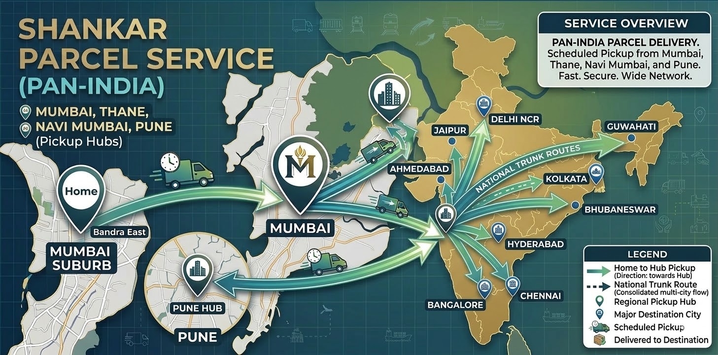Shankar Parcel Services offers reliable parcel delivery across India with convenient pickup available in Mumbai, Thane, Navi Mumbai, Palghar and Pune. Customers can send luggage, household goods and business shipments easily to destinations across the country without visiting parcel offices.