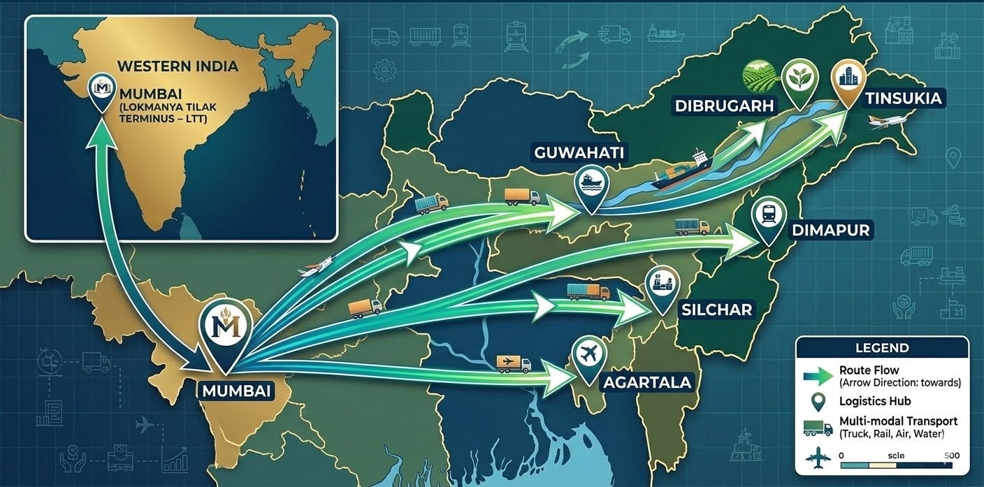 The parcel is loaded onto scheduled trains departing from Mumbai towards North East India destinations.